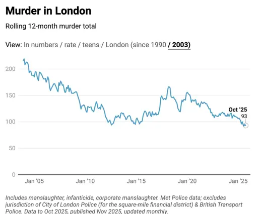 dwouu@lemmy.world · edit-211 days ago93 murders in London (pop: ~9million) in 12 months. London's murder rate is now at the lowest level for decadesplus-squarelemmy.worldimagemessage-square9linkfedilinkarrow-up1201arrow-down17