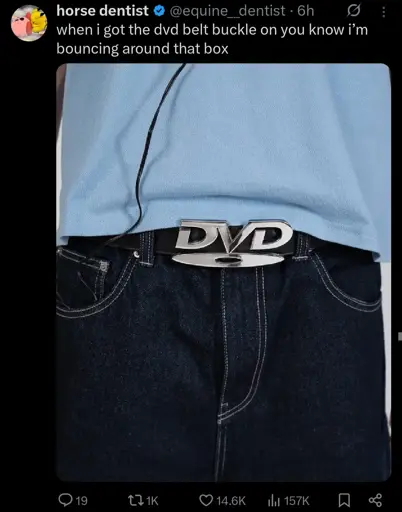 minus-squareSundraylinkfedilinkEnglisharrow-up3·1 month agoI am imagining the hip moves necessary to get that buckled to do the DVD screensaver thing and… ow?