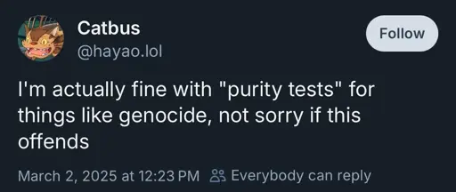 minus-squareBreadOven@lemmy.worldlinkfedilinkEnglisharrow-up20·7 months agoMake them wear a big, veiny drawing of a penis on their forehead. At least it’s slightly easier to identify them.