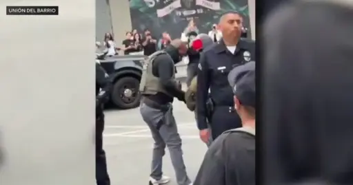 Some of the video circulating online, showing Velez’s arrest, also shows a group of Los Angeles police who appear to be aiding federal agents in the immigration operations.