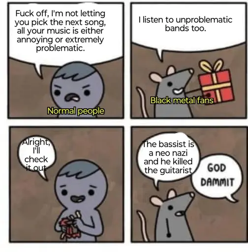 I‘m really drunk so are you saying black metal people are expected to be Nazis? That honestly sucks ass