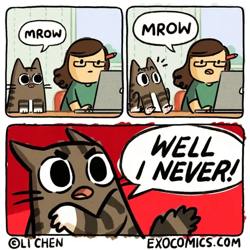 Cat says “Hi”, you think you’ve imitated perfectly but accidentally imply something crude about their mother. Or possibly a horse. Who can tell?