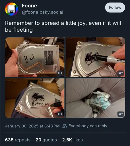 Leave the word ‘bad’. Write ‘bitcoins’, and cross it out. Gives a good reason for it to be the trash, and everyone knows someone who thinks they can recover a hard drive.