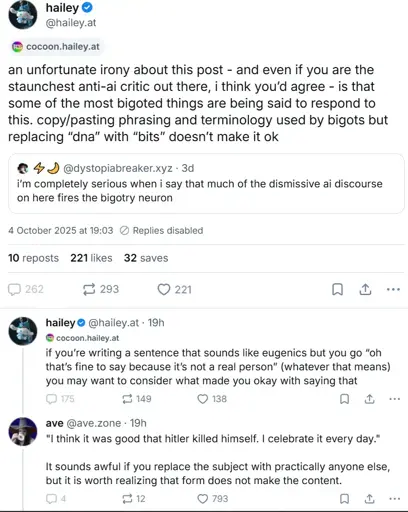 I’ve rewatched the video in case I was being uncharitable. Nope. He accepts the premise (direct quote: “that’s kind of true”). He then does the exact thing I said, which is argue that it’s not acting like a normal pronoun: “the ‘fourth person’ can also refer to a generic pronoun […] it doesn’t refer to a specific referent, like ‘he’ or ‘she’. […] if ‘chat’ is being used to refer to nobody in particular, then arguably it is a new fourth person pronoun.” This is complete and utter nonsense packaged as exciting linguistic concepts, which is not at all “cool and good.”